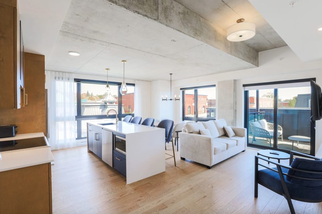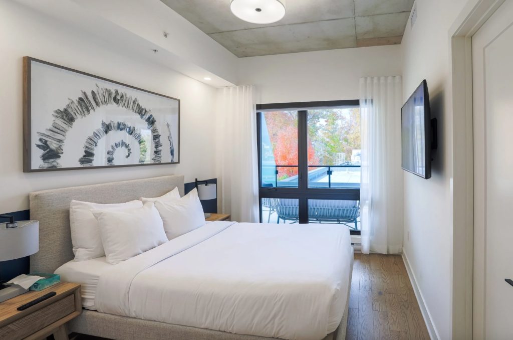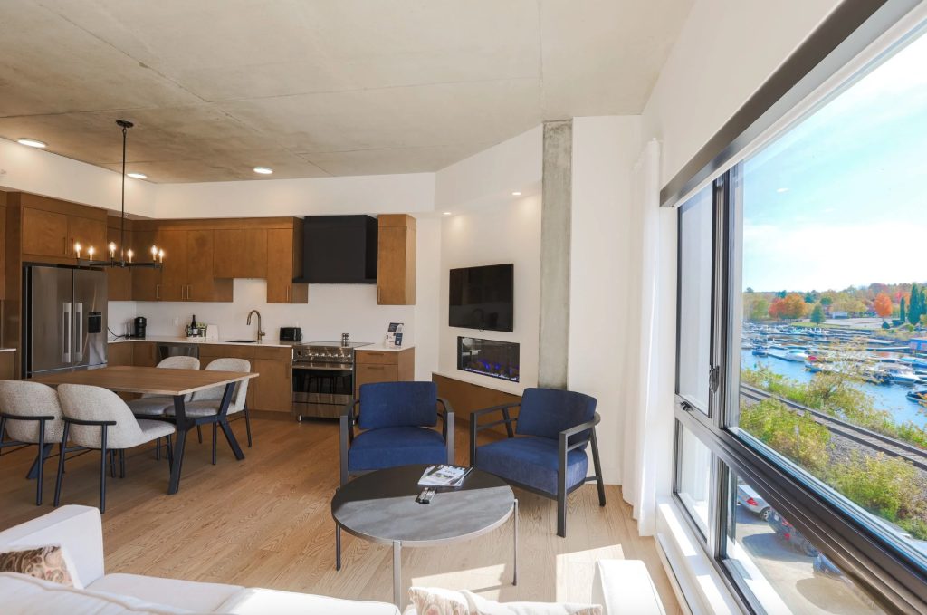 L’un des grands atouts de l’hôtel réside dans son concept de condo-hôtel, qui marie l’autonomie d’un appartement privé aux services et au prestige d’un établissement haut de gamme. Chaque unité est aménagée avec soin, offrant des espaces lumineux, un mobilier élégant et des équipements complets permettant de cuisiner, de travailler ou simplement de se détendre comme à la maison. Le stationnement intérieur chauffé constitue également un avantage appréciable, particulièrement durant la saison froide, tout en permettant aux visiteurs de laisser leur voiture et de découvrir Magog à pied.