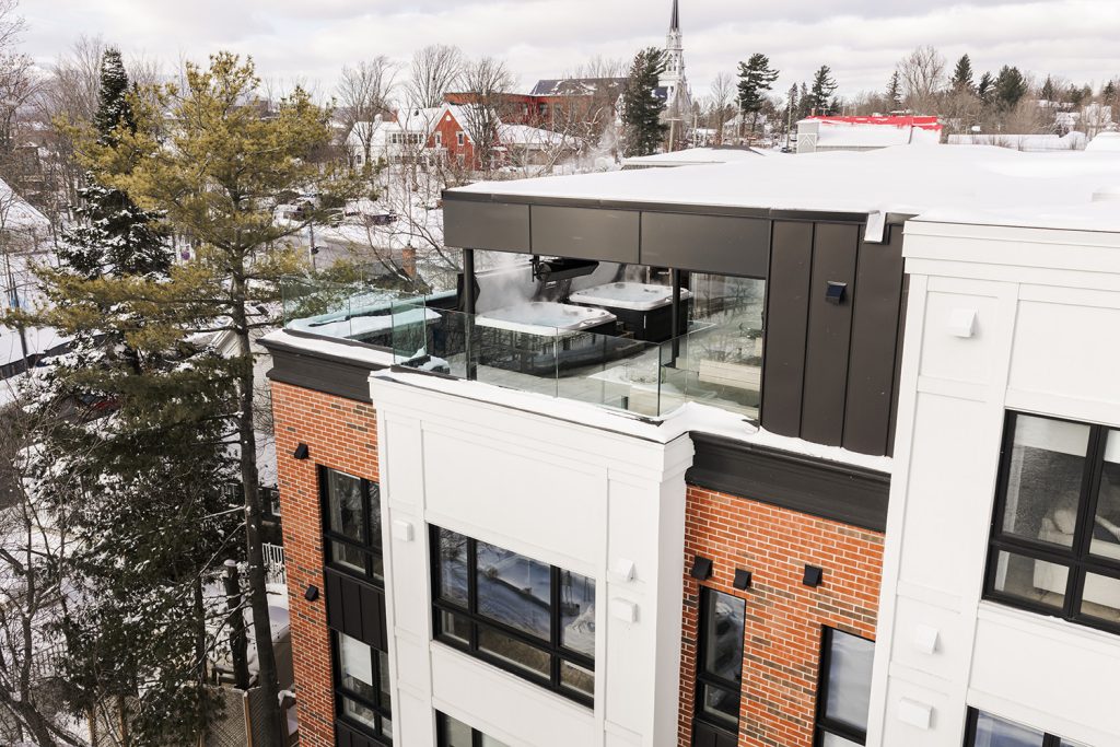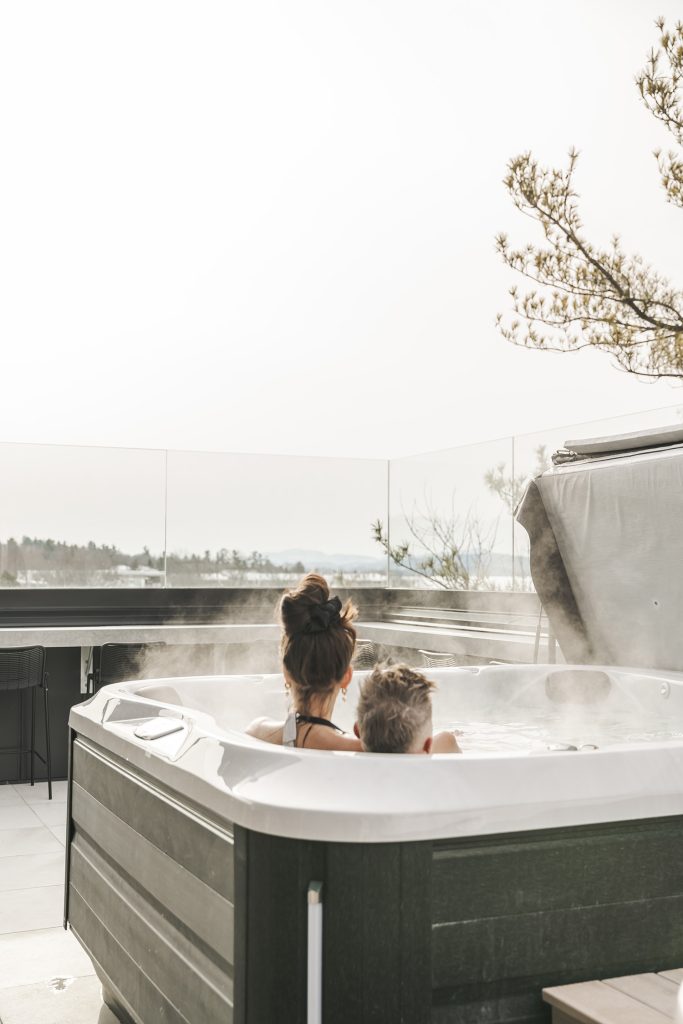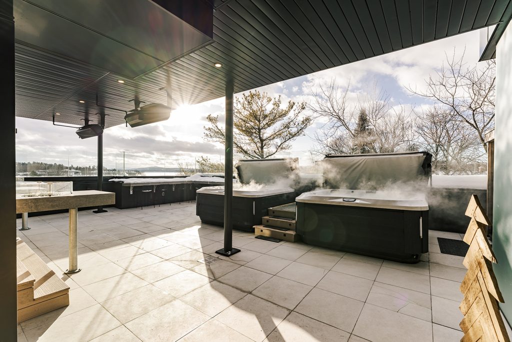 Le point culminant de l’expérience proposée par l’hôtel demeure sans doute sa terrasse quatre saisons, chauffée et orientée vers le majestueux Lac Memphrémagog. Située au quatrième étage, elle offre une vue panoramique imprenable sur le lac et les environs. Accessible aux clients, cette terrasse accueille une véritable expérience thermale comprenant des spas, un sauna et une douche froide. Ce parcours permet de relaxer le corps et l’esprit, été comme hiver, tout en profitant d’un décor naturel spectaculaire. Un espace lounge extérieur complète l’expérience, invitant aux apéros face au lac, autour de foyers intégrés aux tables, créant une ambiance chaleureuse et conviviale.