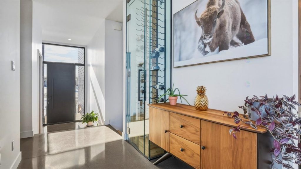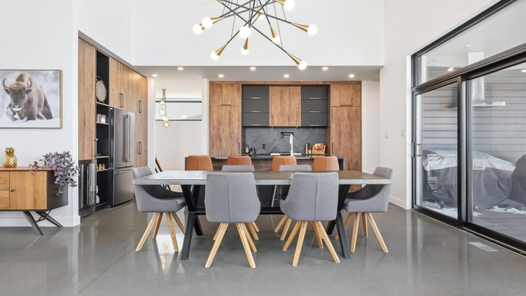 La salle à manger, située à proximité, s’intègre harmonieusement à l’aire de vie. Elle peut accueillir une grande table, idéale pour recevoir famille et amis lors de repas animés. L’ambiance conviviale de cet espace favorise les longues discussions et les moments partagés autour de la table. Un espace a également été prévu pour un cellier pouvant contenir jusqu’à 80 bouteilles, un détail apprécié des amateurs de vin et des hôtes qui aiment recevoir.