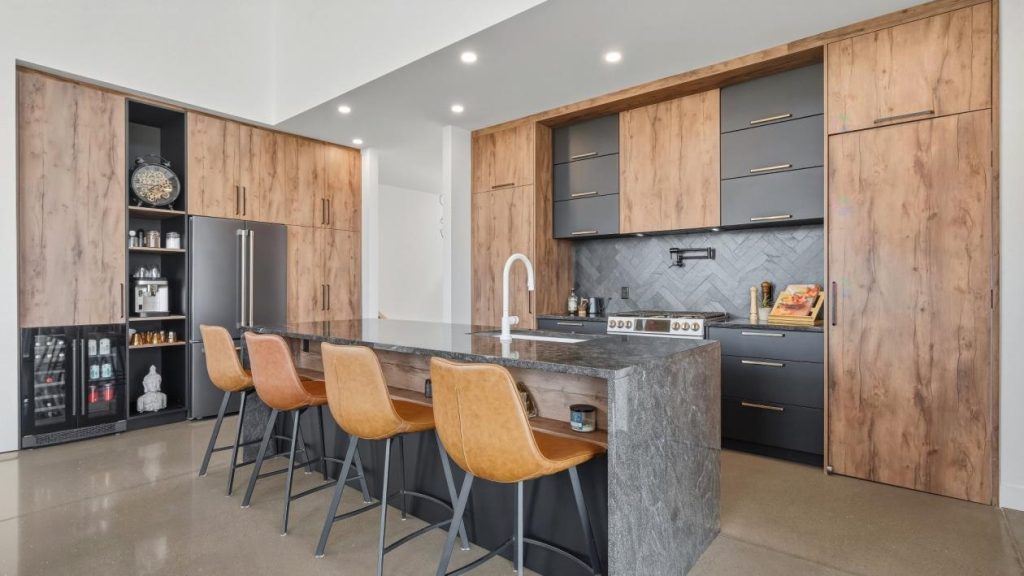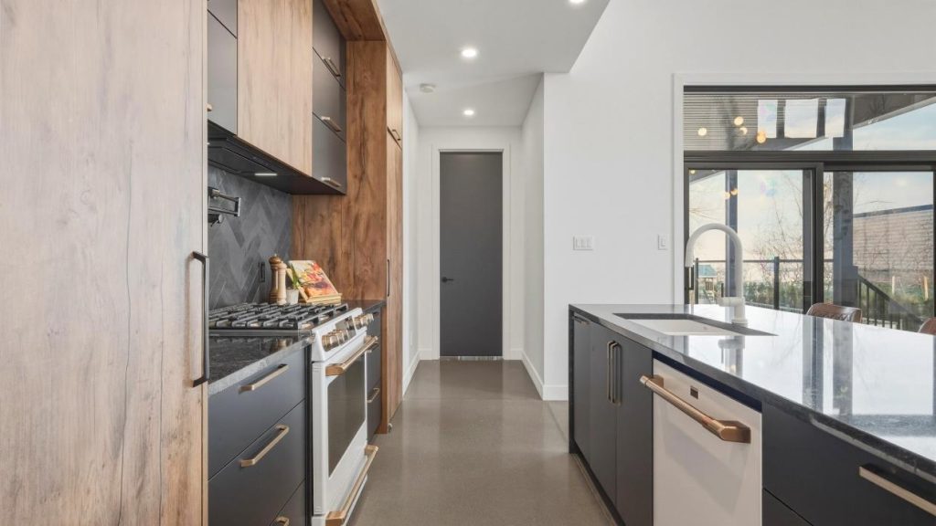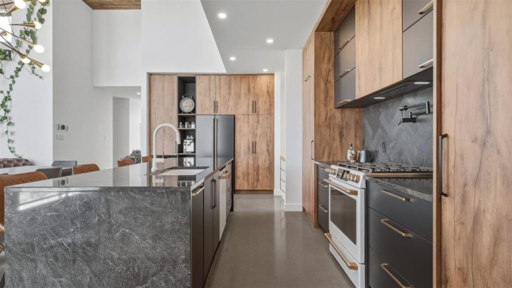 À l’arrière, une arrière-cuisine ajoute une dimension pratique à l’ensemble. On y retrouve un évier, un espace prévu pour un second réfrigérateur ainsi qu’un garde-manger généreux. Cet espace supplémentaire facilite la préparation des repas et permet de conserver une cuisine principale toujours impeccable, même lors de grandes réceptions.