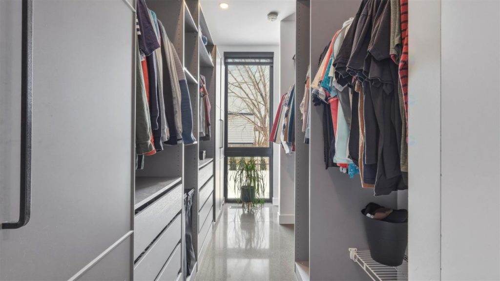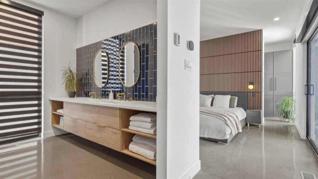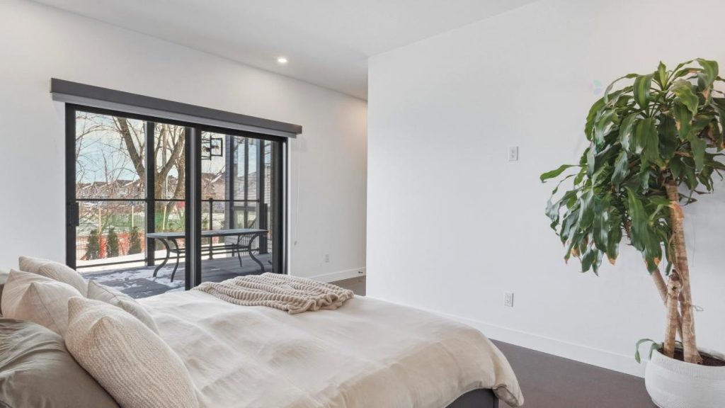 La chambre principale propose un espace à la fois vaste et élégant, conçu comme un véritable lieu privé. Un walk-in spacieux permet d’organiser vêtements, chaussures et accessoires avec facilité. Une porte coulissante mène directement à la terrasse, laissant entrer une belle luminosité et offrant un accès privilégié à l’extérieur. La salle de bains attenante se distingue par son design soigné. On y retrouve une grande douche double en céramique, des lavabos doubles ainsi qu’un comptoir en quartz qui s’harmonise parfaitement avec le style de la maison. L’ensemble crée un environnement apaisant, idéal pour commencer la journée en douceur ou pour se détendre en soirée.