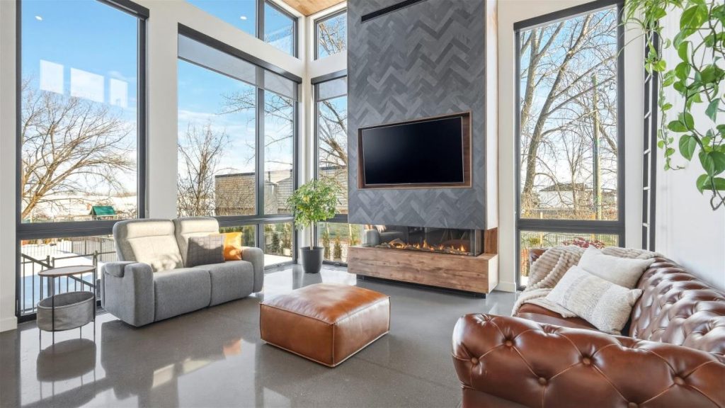 Le salon principal impressionne par sa hauteur sous plafond de 16 pieds, créant un effet spectaculaire dès qu’on y pénètre. Les murs dotés de nombreuses fenêtres pratiquement pleine hauteur laissent entrer une abondante lumière naturelle et donnent l’impression de vivre en harmonie avec l’extérieur. Le regard est naturellement attiré vers le foyer au gaz, habillé d’un manteau en ardoise qui apporte une touche chaleureuse et sophistiquée à l’ensemble. Cet espace invite à la détente, que ce soit pour regarder un film, se plonger dans un bon livre ou simplement profiter d’un moment de calme dans une atmosphère enveloppante.