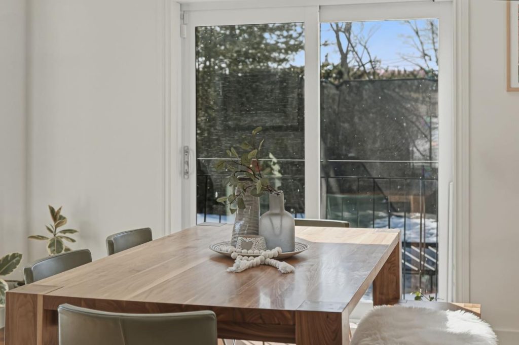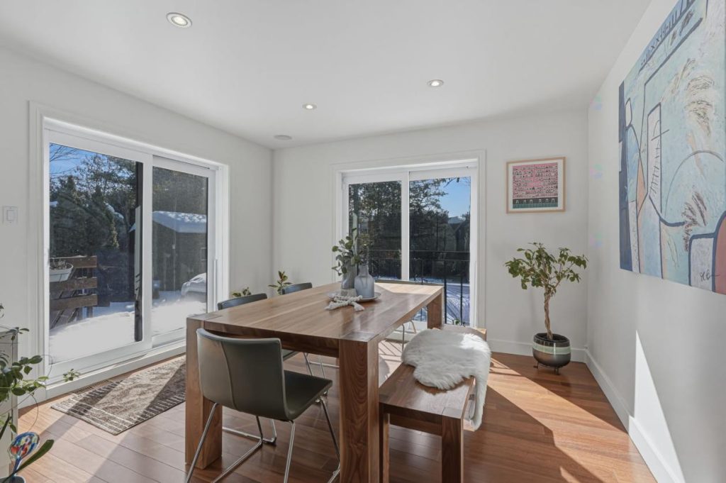 Dans le prolongement direct de la cuisine, la salle à manger bénéficie d’une luminosité exceptionnelle grâce à ses deux portes-patio donnant accès à la terrasse. Cet espace se prête parfaitement à l’intégration de plantes, qui viennent accentuer son caractère vivant et apaisant. C’est l’endroit rêvé pour organiser des soupers mémorables, où l’ambiance se veut à la fois élégante et conviviale.