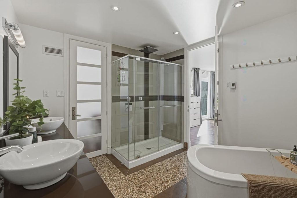À l’étage, la chambre principale séduit par ses dimensions généreuses et sa luminosité abondante. Ses fenêtres orientées sur deux côtés offrent une vue apaisante sur la cour, créant un espace intime et reposant. L’ambiance y est douce et sereine, parfaite pour se ressourcer. La salle de bain attenante, au design moderne, invite à la détente avec ses installations raffinées, idéales pour bien commencer la journée ou la conclure dans le calme.