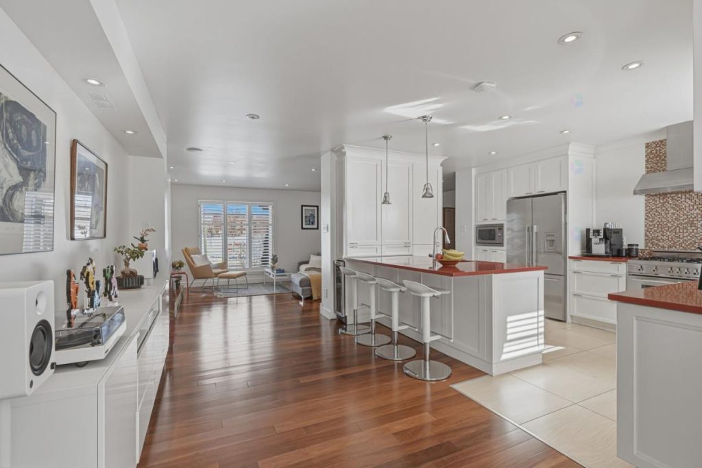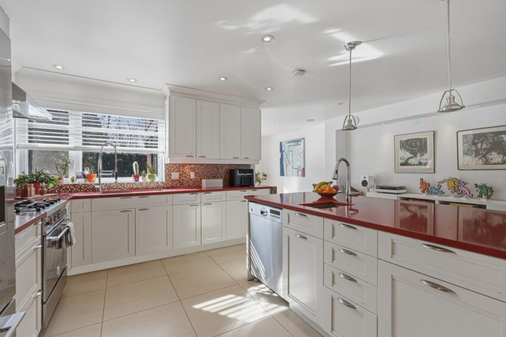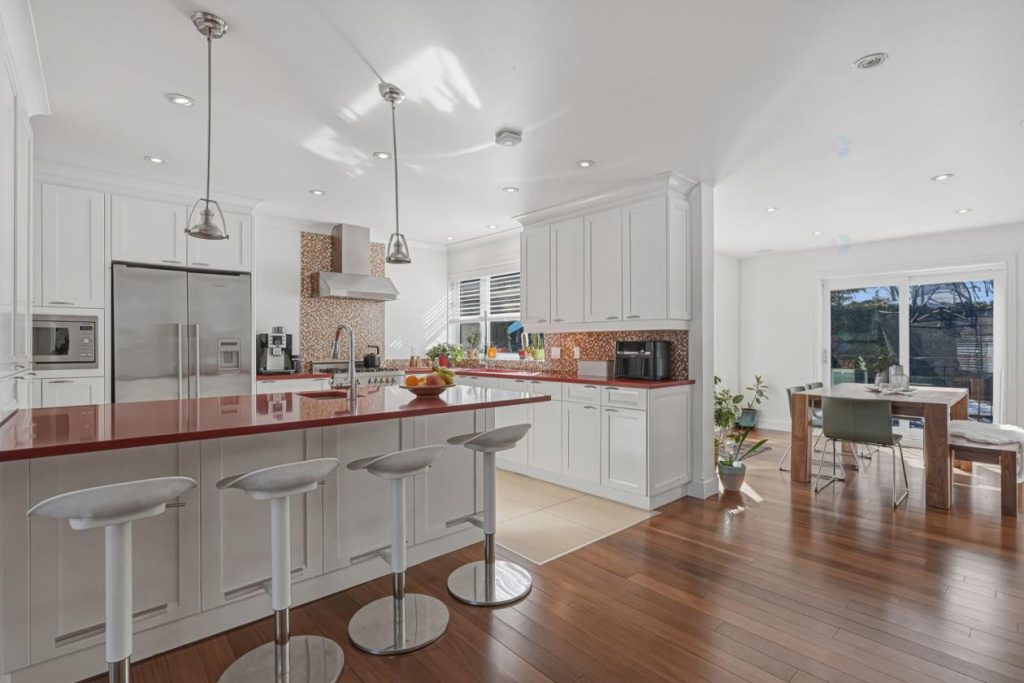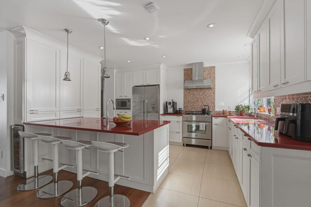 La cuisine contemporaine se distingue par son design épuré et ses équipements soigneusement sélectionnés. Son vaste îlot central devient rapidement le point de rassemblement de la maison, que ce soit pour cuisiner ou simplement partager un moment. Les comptoirs en quartz ajoutent une touche de sophistication tout en offrant une surface pratique et durable. Les nombreux rangements permettent de maintenir un espace ordonné, tandis que la grande fenêtre inonde la pièce de lumière naturelle, créant une ambiance accueillante. À proximité, un coin musique apporte une dimension originale et inspirante, permettant d’écouter des vinyles tout en préparant les repas.