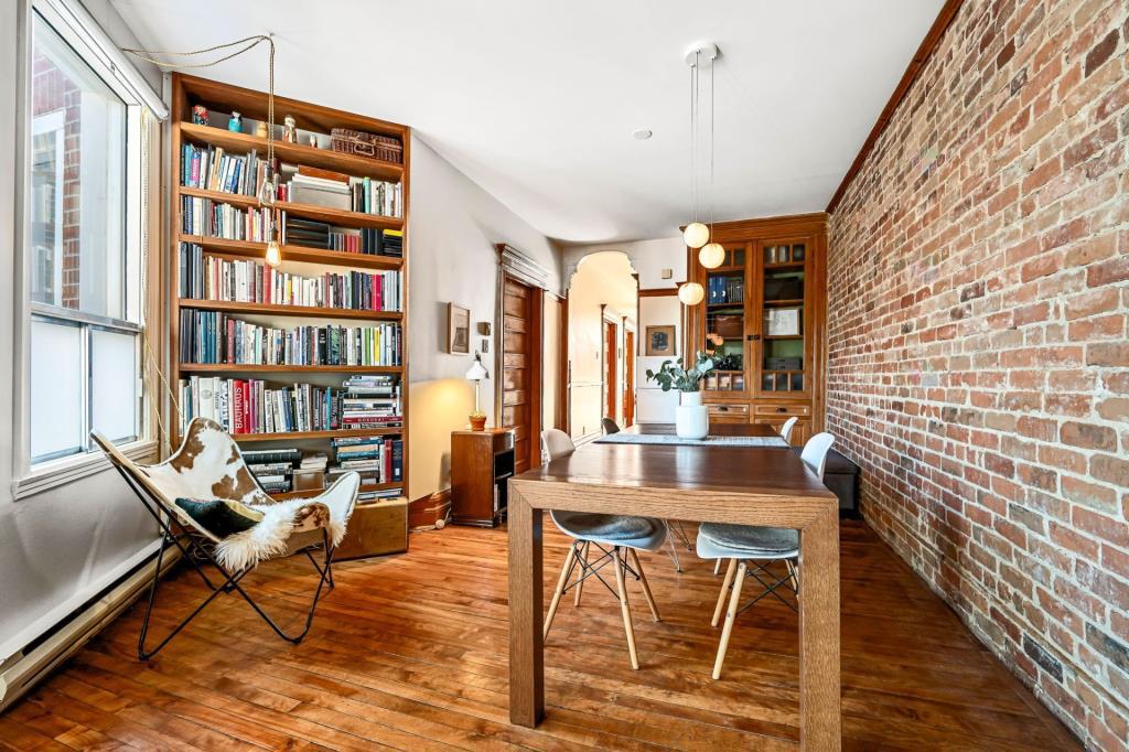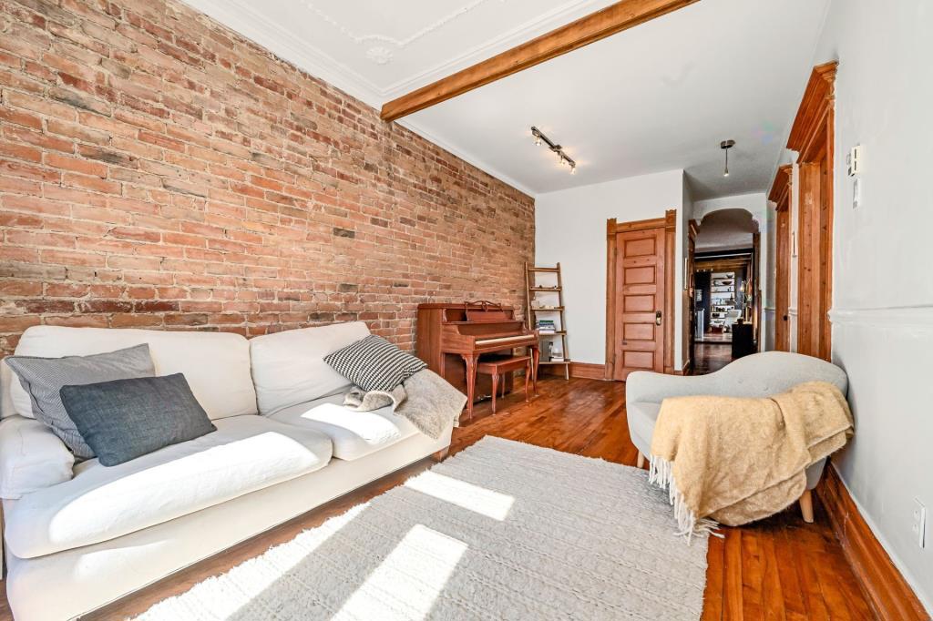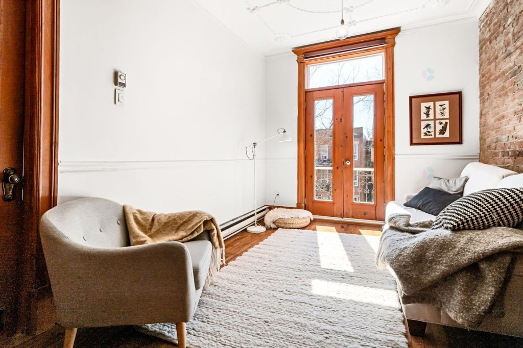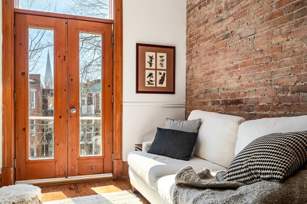 Dès l’entrée, le salon dévoile une atmosphère chaleureuse et accueillante. Cet espace de vie polyvalent se prête aussi bien aux moments de détente qu’aux réceptions entre proches. Les portes vitrées qui s’ouvrent sur le balcon laissent entrer une abondante lumière naturelle, créant un environnement vivant et apaisant. Ce coin devient rapidement un lieu de prédilection pour aménager un espace verdoyant avec quelques plantes. Le mur de brique apparent, jumelé aux superbes moulures d’origine, confère à la pièce une personnalité affirmée et un charme intemporel.