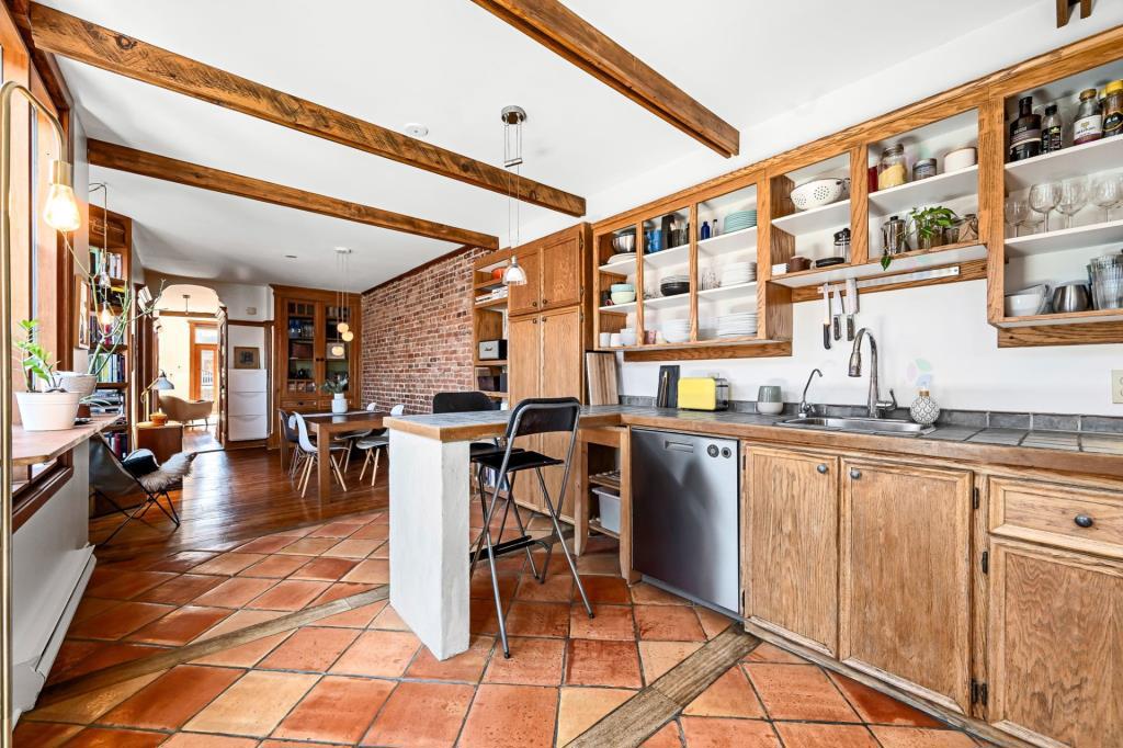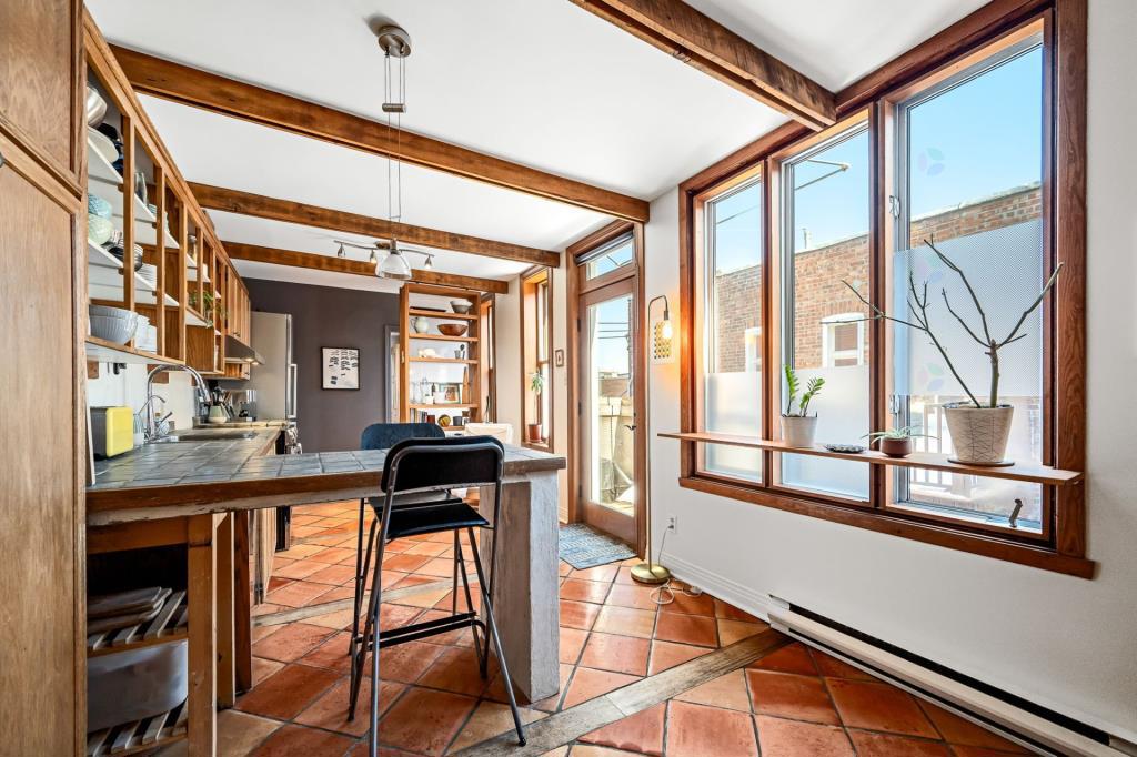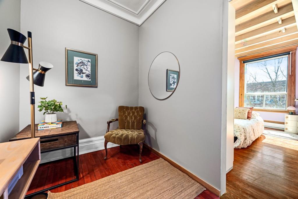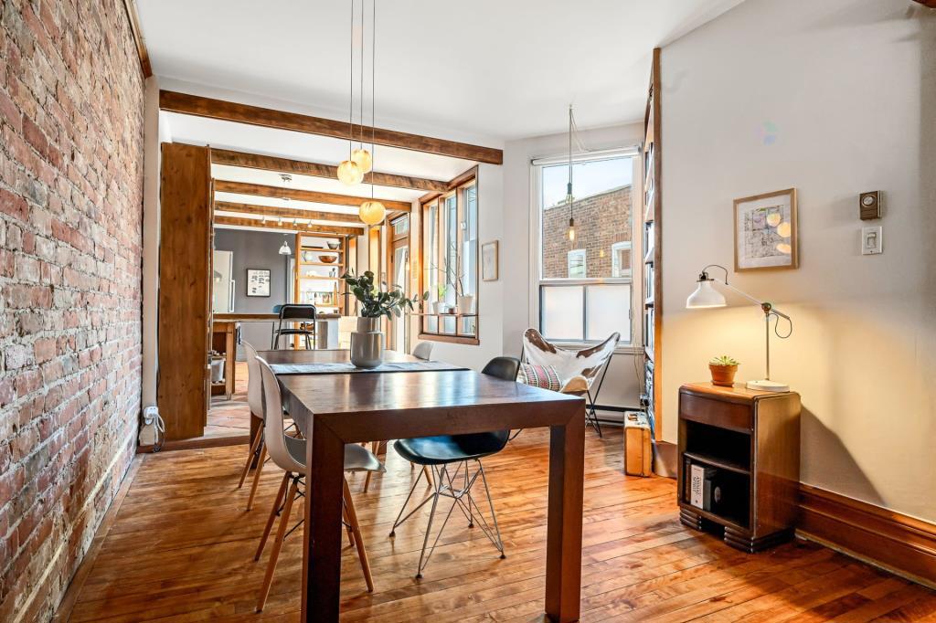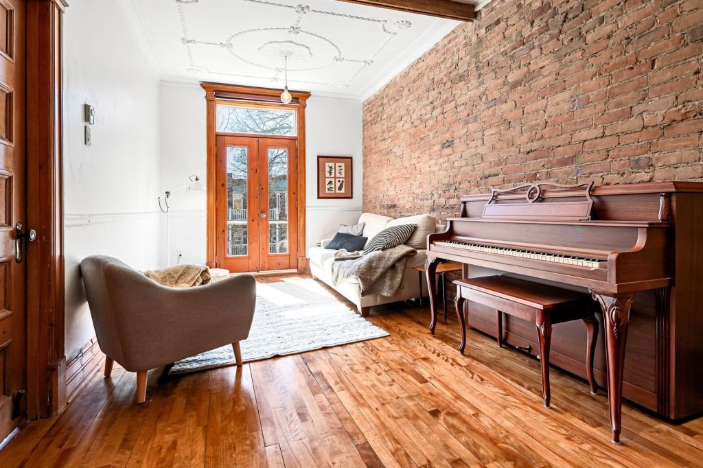 Dès l’entrée, le salon dévoile une atmosphère chaleureuse et accueillante. Cet espace de vie polyvalent se prête aussi bien aux moments de détente qu’aux réceptions entre proches. Les portes vitrées qui s’ouvrent sur le balcon laissent entrer une abondante lumière naturelle, créant un environnement vivant et apaisant. Ce coin devient rapidement un lieu de prédilection pour aménager un espace verdoyant avec quelques plantes. Le mur de brique apparent, jumelé aux superbes moulures d’origine, confère à la pièce une personnalité affirmée et un charme intemporel.