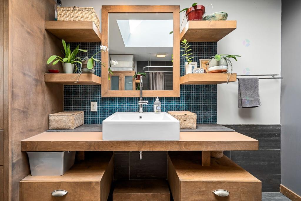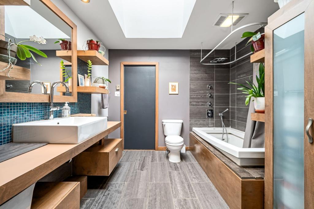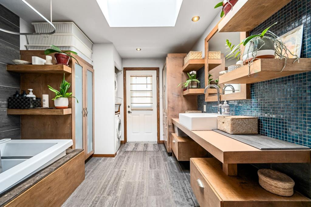 La salle de bain, elle aussi rénovée avec goût, constitue un véritable espace de bien-être. Grâce à son puits de lumière, elle bénéficie d’une clarté naturelle qui accentue la sensation d’espace et de sérénité. Les choix de matériaux et les finitions contribuent à créer une atmosphère apaisante, idéale pour commencer la journée en douceur ou s’accorder un moment de détente en soirée. Chaque détail y a été pensé pour allier esthétique et confort.