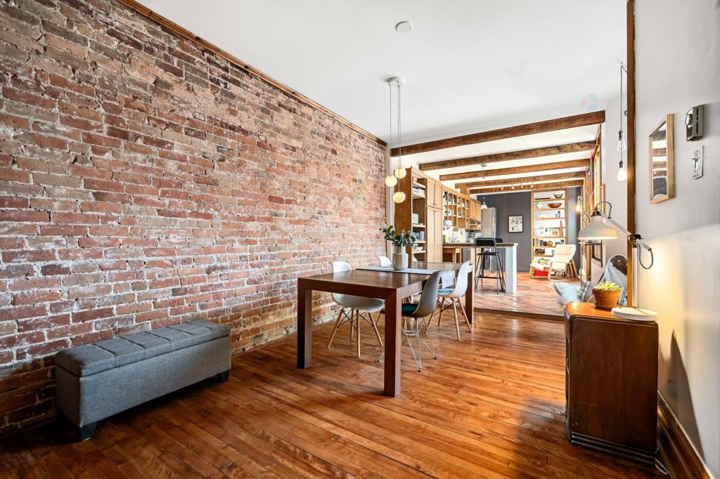 À quelques pas, la salle à manger offre un cadre idéal pour recevoir. Sa configuration permet d’y installer aisément une grande table, parfaite pour les repas conviviaux en famille ou entre amis. L’ambiance y est douce et propice aux échanges, dans un décor à la fois enveloppant et raffiné. Le mur de brique, en continuité avec le salon, ainsi que les meubles en bois encastrés sur mesure, apportent une note distinctive et une signature visuelle forte qui rehausse l’ensemble de la pièce.