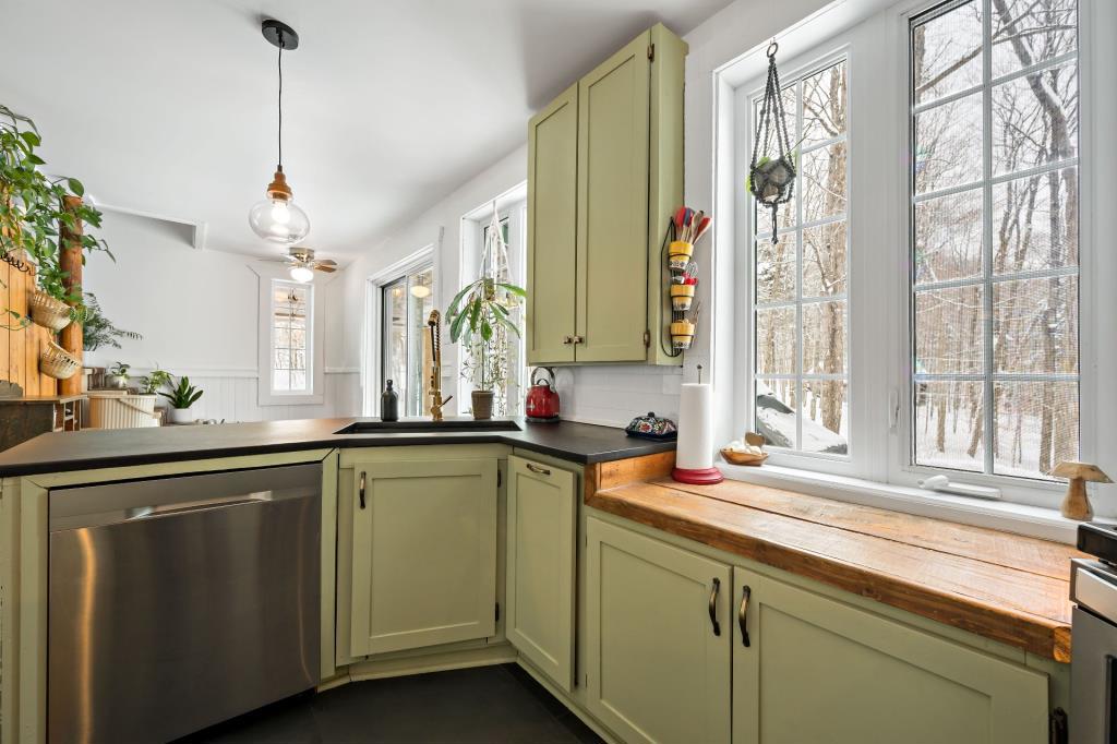 À proximité, la grande cuisine séduit par sa fonctionnalité et son organisation. Tout y est pensé pour faciliter le quotidien : de nombreux espaces de rangement permettent de garder les lieux ordonnés, tandis que les surfaces de travail généreuses offrent tout le nécessaire pour cuisiner avec aisance. La vue sur la nature environnante ajoute une dimension apaisante à l’ensemble, transformant chaque moment passé en cuisine en une expérience agréable et inspirante.