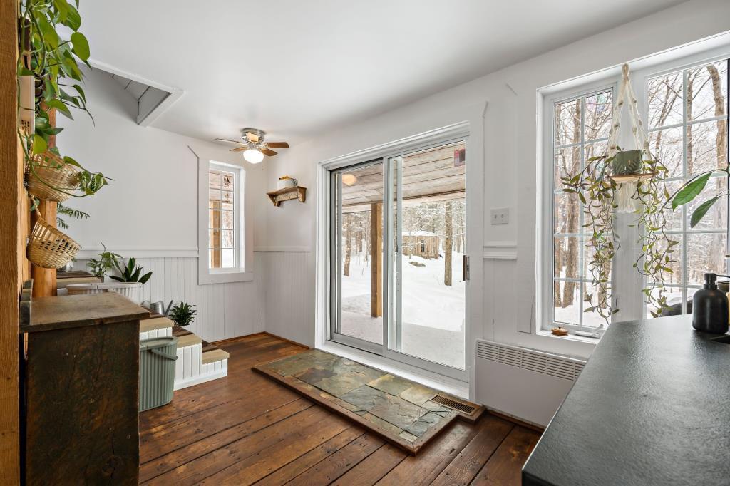 À l’étage, deux chambres à coucher offrent des espaces intimes et paisibles. L’une d’elles est actuellement aménagée en bureau, démontrant toute la flexibilité qu’offre la propriété. Que ce soit pour le télétravail, une chambre d’invités ou un espace créatif, les possibilités d’aménagement sont nombreuses. L’ambiance y est douce et reposante, parfaite pour se ressourcer dans un environnement calme et serein.
