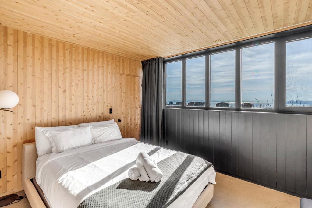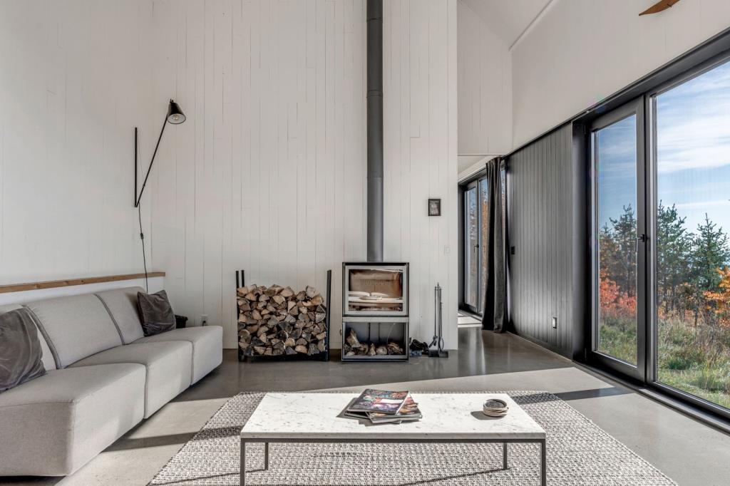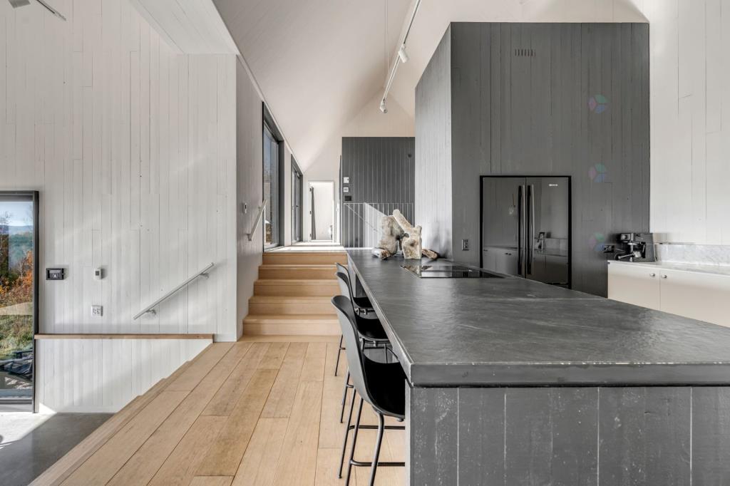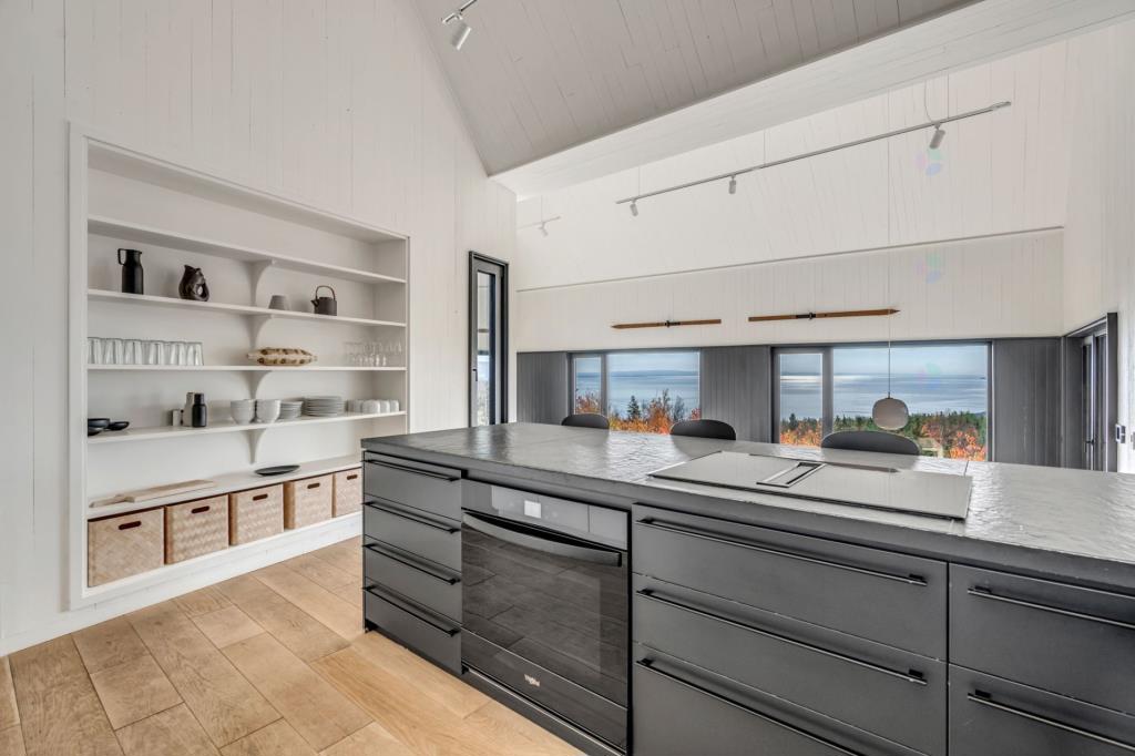 Dès l’entrée, l’effet est saisissant. Le regard est immédiatement capté par une vue spectaculaire sur le fleuve Saint-Laurent et la nature environnante. Cette première impression donne le ton à l’ensemble du chalet, où chaque espace a été pensé pour mettre en valeur le paysage. L’atmosphère qui s’en dégage évoque à la fois le prestige et la sérénité, dans un équilibre parfaitement maîtrisé.