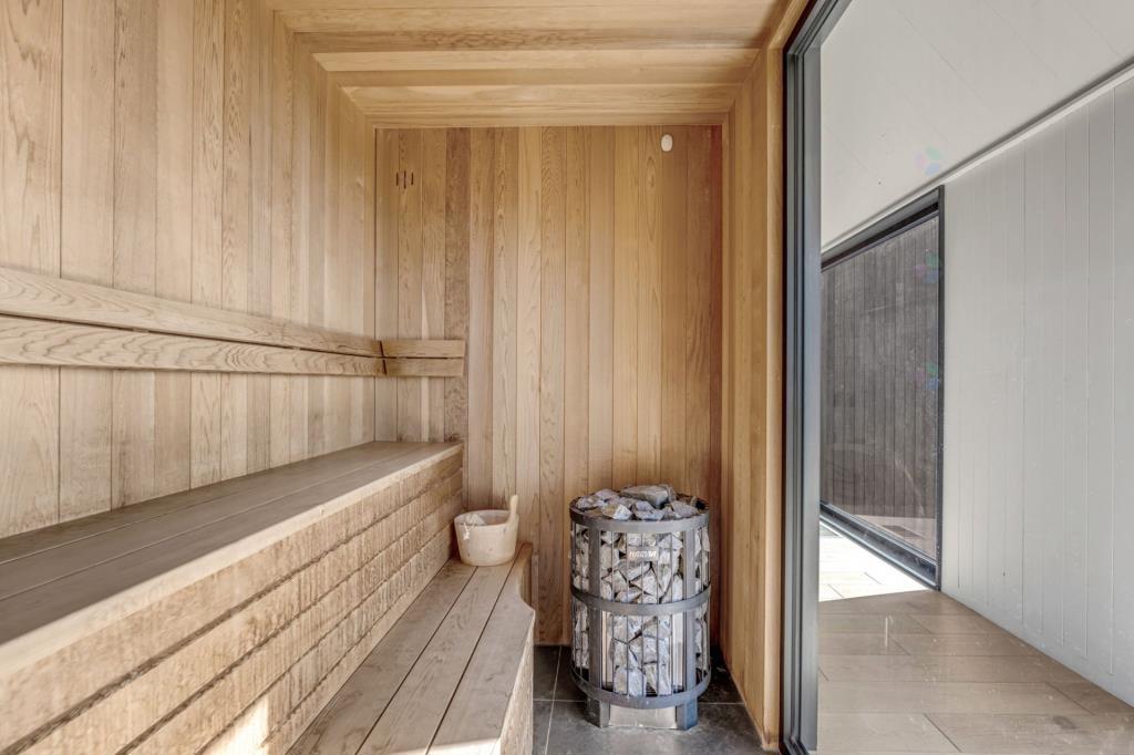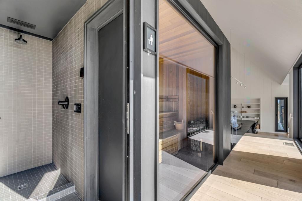 Le sauna, judicieusement positionné, constitue un atout distinctif. Il permet de se détendre tout en profitant d’une vue apaisante sur l’extérieur. Cet espace bien-être s’intègre parfaitement à l’expérience globale du chalet, ajoutant une touche de luxe et de confort appréciable.