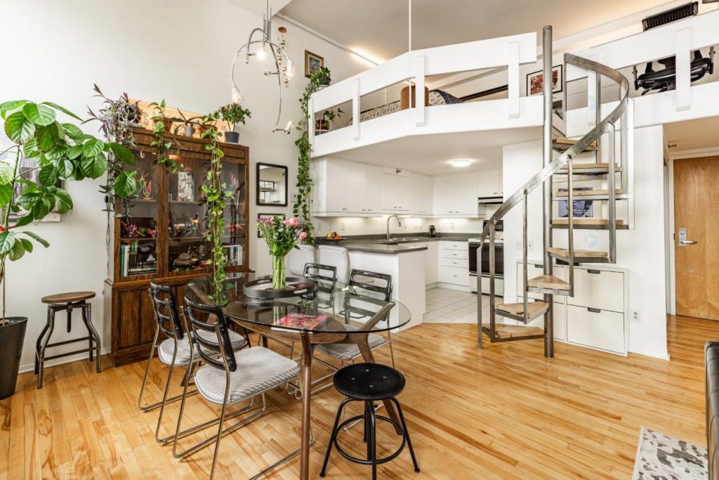 Situé au quatrième étage de l’immeuble patrimonial emblématique du Mont-Saint-Louis, ce condo de style loft se distingue immédiatement par son caractère unique et sa magnifique mezzanine. Dès le premier regard, la hauteur impressionnante des plafonds et la générosité de la fenestration créent une atmosphère à la fois lumineuse sur deux niveaux. L’escalier en colimaçon attire instantanément l’attention et devient un élément central du décor, ajoutant une touche architecturale remarquable.