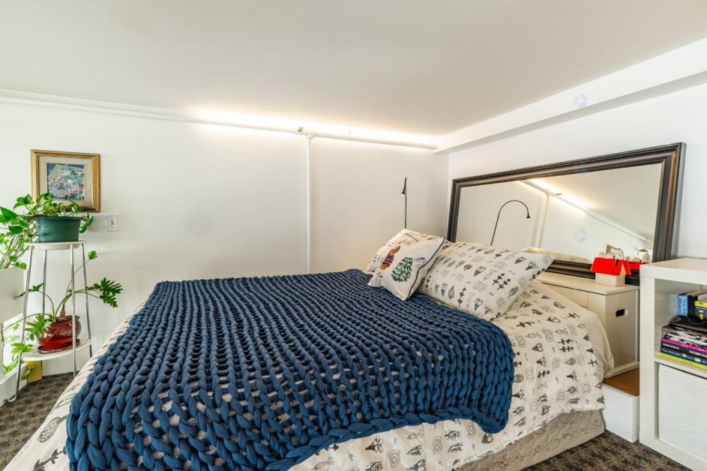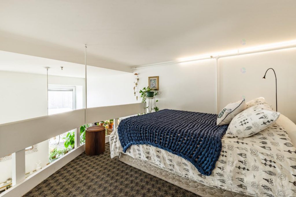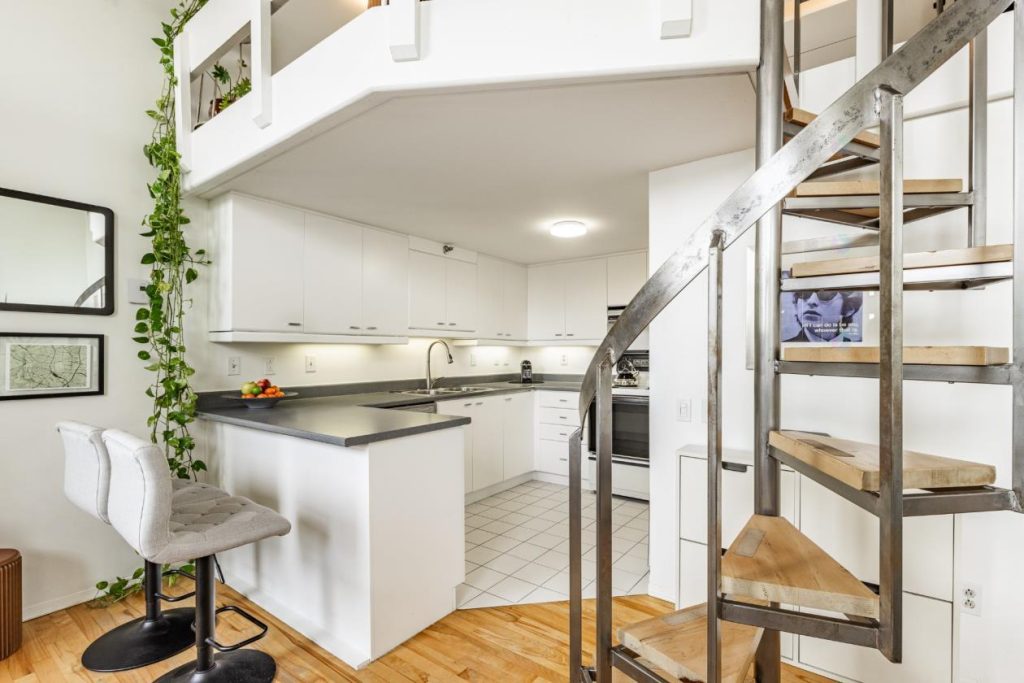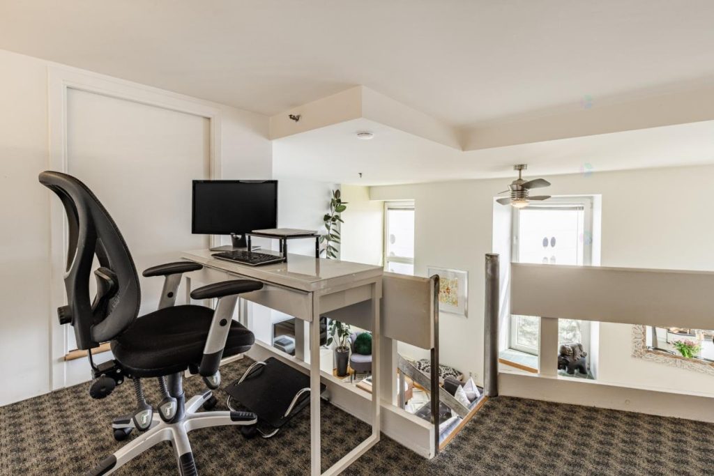 L’élégant escalier en colimaçon mène à la mezzanine, où se trouvent actuellement la chambre à coucher et un espace bureau. Cette configuration distinctive apporte à la fois originalité et fonctionnalité. L’espace bureau est idéal pour travailler ou se consacrer à des projets personnels dans un environnement propice à la concentration. La chambre, quant à elle, bénéficie d’un cadre intime tout en restant ouverte sur le reste du loft, créant une atmosphère unique.