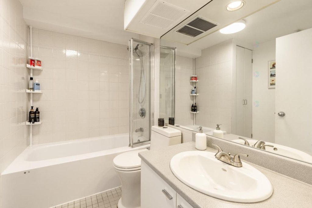La salle de bain, moderne et bien aménagée, s’harmonise parfaitement avec le style général du condo. Elle offre un espace fonctionnel et esthétique, en cohérence avec la qualité des autres pièces.