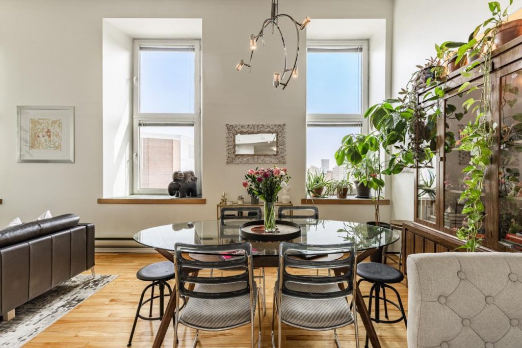 Dans la continuité de cet espace se trouve la salle à manger, qui s’intègre harmonieusement à l’ensemble. On peut facilement y installer une belle table pour partager des repas conviviaux. Les deux fenêtres apportent une luminosité naturelle qui dynamise la pièce et renforce son atmosphère chaleureuse. L’espace disponible permet également d’ajouter une bibliothèque ou un coin bar, ce qui enrichit encore davantage les possibilités d’aménagement. Comme dans le reste du condo, la lumière abondante en fait un lieu idéal pour intégrer des plantes, contribuant à une ambiance vivante et agréable.