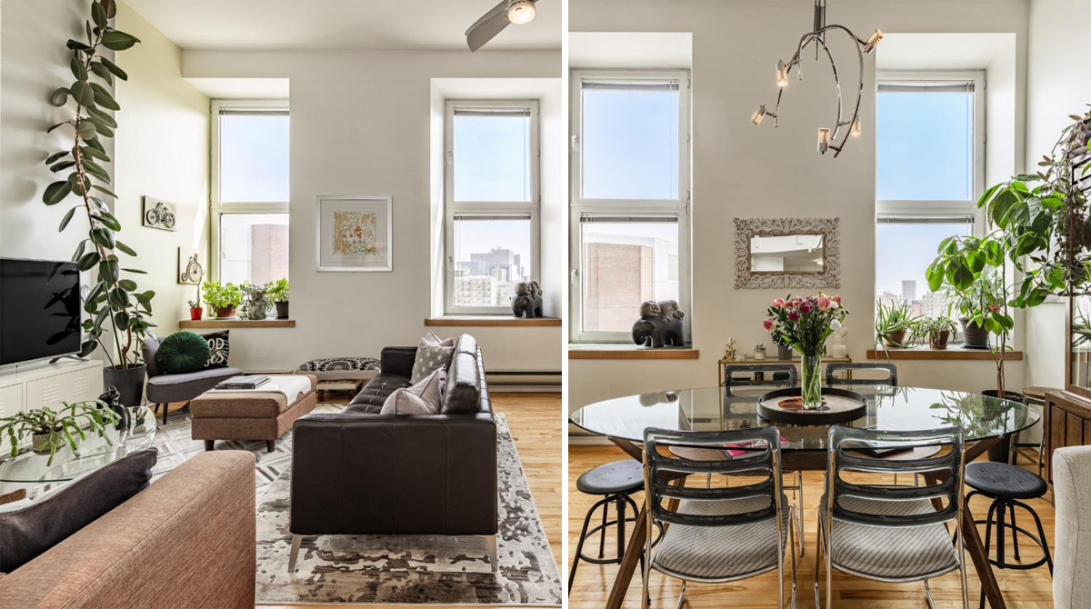 Dans la continuité de cet espace se trouve la salle à manger, qui s’intègre harmonieusement à l’ensemble. On peut facilement y installer une belle table pour partager des repas conviviaux. Les deux fenêtres apportent une luminosité naturelle qui dynamise la pièce et renforce son atmosphère chaleureuse. L’espace disponible permet également d’ajouter une bibliothèque ou un coin bar, ce qui enrichit encore davantage les possibilités d’aménagement. Comme dans le reste du condo, la lumière abondante en fait un lieu idéal pour intégrer des plantes, contribuant à une ambiance vivante et agréable.