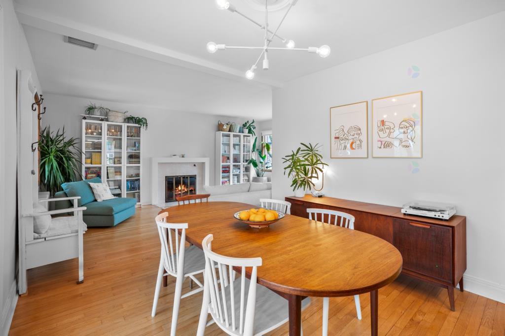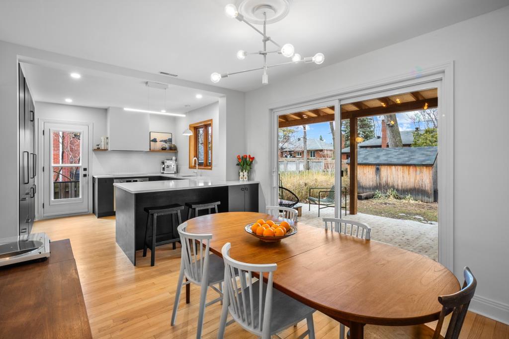 Juste à côté, la salle à manger s’intègre parfaitement à l’ensemble et offre un espace généreux pour accueillir une grande table. Elle devient ainsi un lieu idéal pour recevoir famille et amis dans une atmosphère chaleureuse. La grande porte-patio laisse entrer une lumière naturelle abondante et crée une belle ouverture sur l’extérieur. Cet espace est propice aux longues discussions autour d’un bon repas, dans un cadre lumineux et accueillant.
