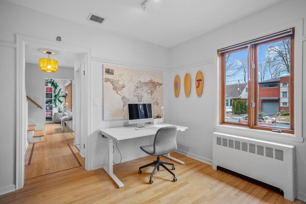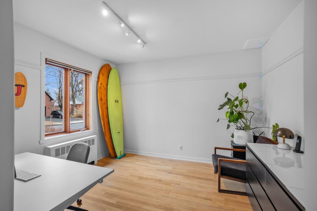 Toujours au rez-de-chaussée, un bureau complète l’aménagement. Cet espace polyvalent est idéal pour se concentrer sur le travail ou les projets personnels. Il peut également être transformé en chambre selon les besoins, démontrant toute la flexibilité de la propriété. Cette adaptabilité en fait un atout précieux pour les familles ou les professionnels en télétravail.
