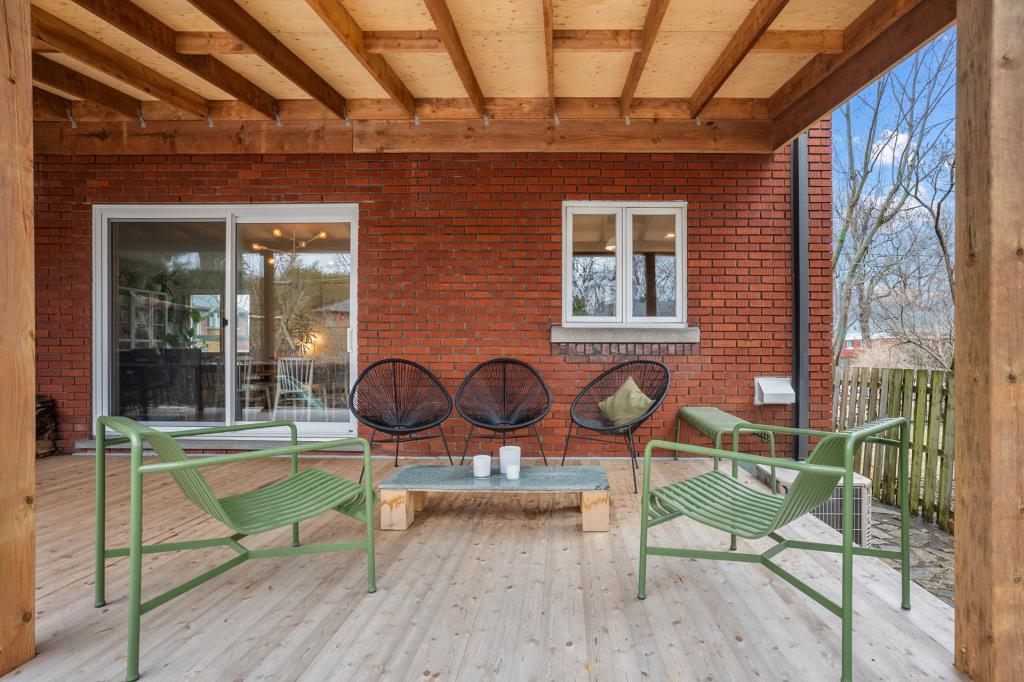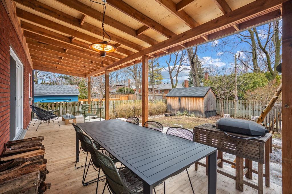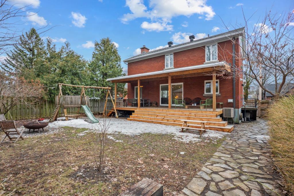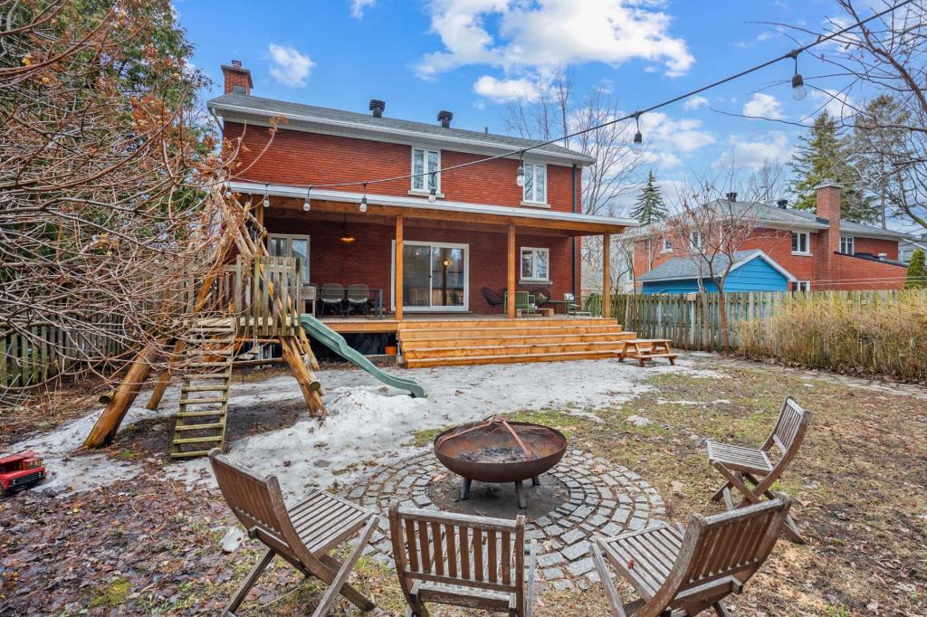 À l’extérieur, la propriété se démarque par une cour exceptionnelle. La grande terrasse couverte de 30 pieds par 10 pieds constitue un lieu parfait pour les repas et les réceptions durant la belle saison. La cour spacieuse permet également d’aménager un espace de jeux ainsi qu’un coin feu, créant un environnement idéal pour profiter des journées d’été en toute intimité.