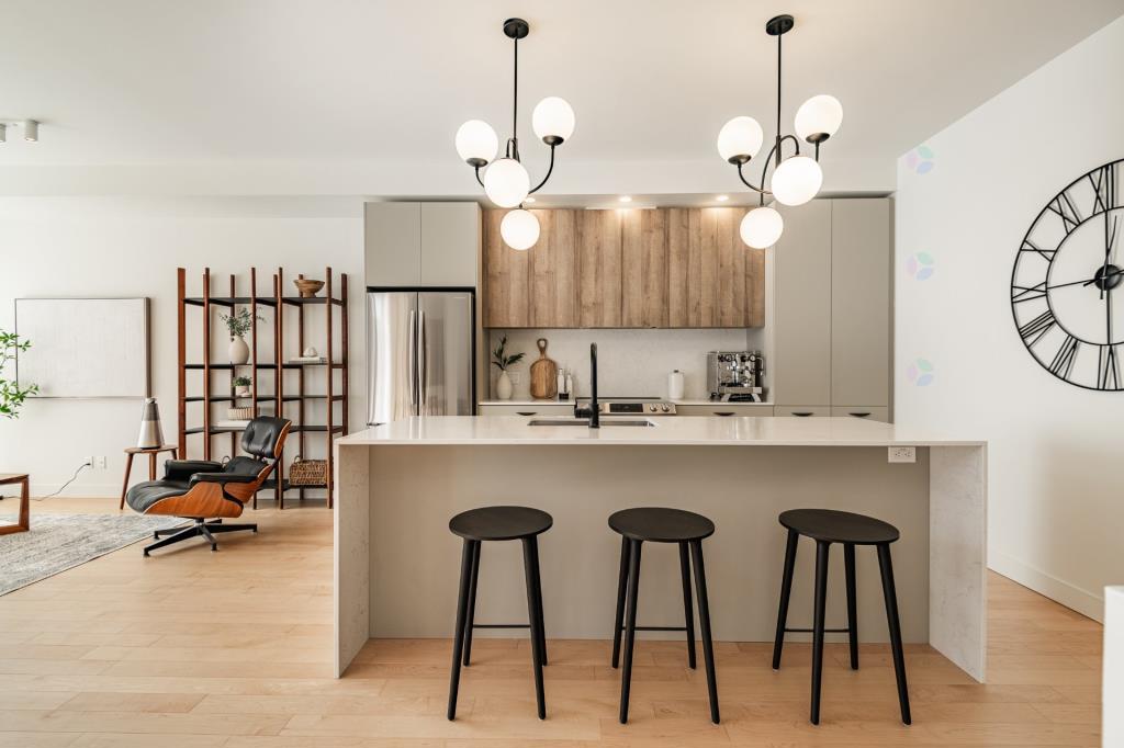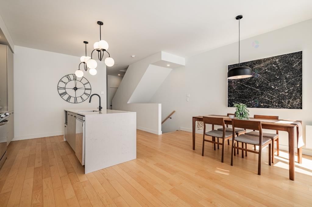 À quelques pas, la cuisine et la salle à manger forment un espace convivial. La cuisine au design deux tons se distingue par ses finitions haut de gamme et ses matériaux soigneusement sélectionnés. Les comptoirs en quartz, le dosseret assorti et les armoires pleine hauteur assurent élégance et fonctionnalité. Un îlot avec comptoir-lunch pour trois personnes devient un point central pour repas rapides et échanges. La salle à manger, spacieuse et lumineuse, permet de recevoir dans une ambiance chaleureuse et raffinée, parfaite pour des repas entre amis ou en famille.