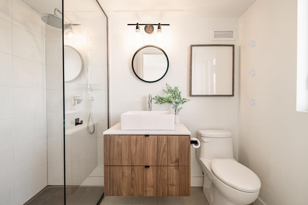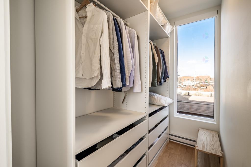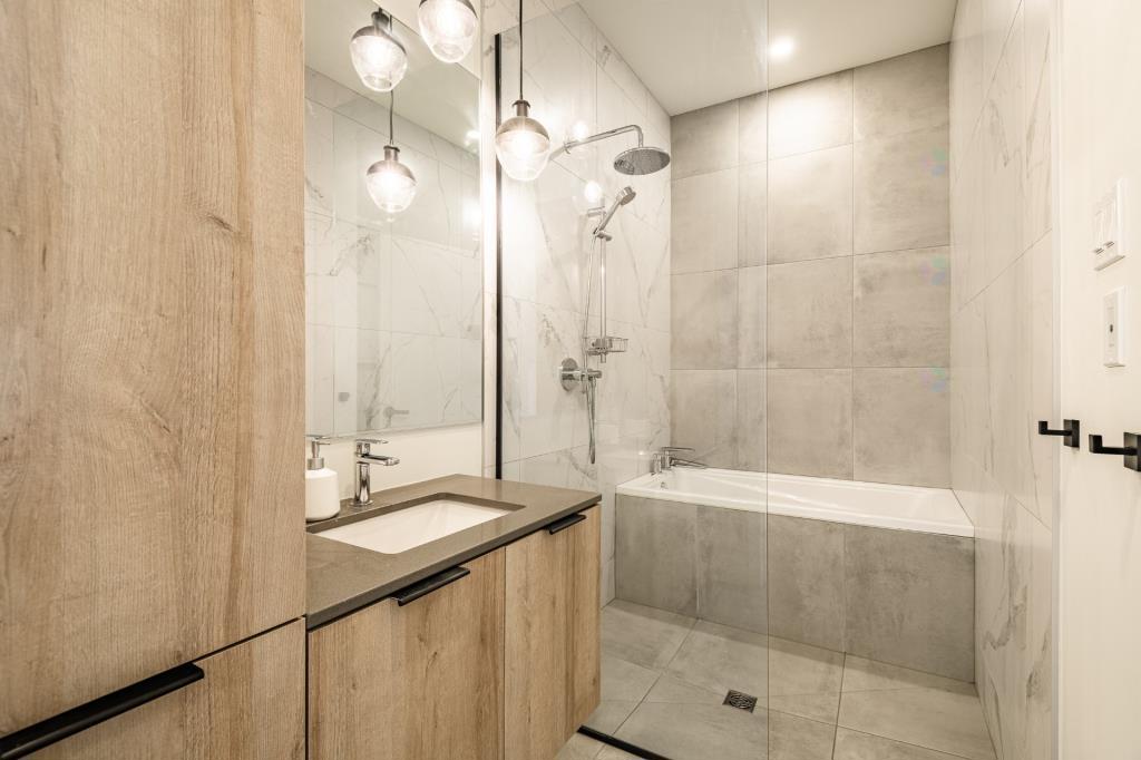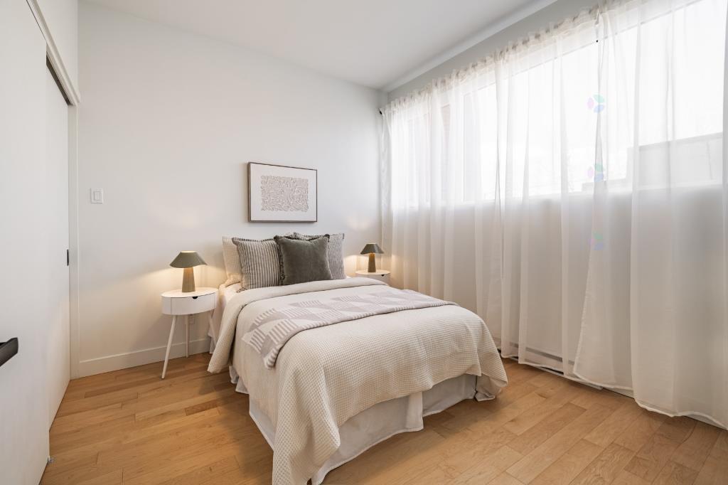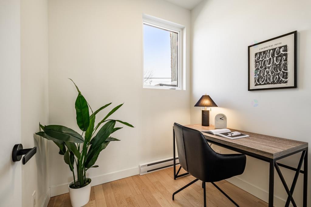 Toujours sur le même niveau, on retrouve une chambre de belle dimension ainsi qu’une pièce pouvant servir de bureau. Cet espace convient parfaitement au télétravail ou à des projets personnels dans un cadre propice à la concentration. La séparation des zones de vie ajoute à la fonctionnalité du condo et améliore le confort au quotidien. Une salle de bain moderne complète l’étage avec une douche pratique pour les matins pressés et une baignoire invitante pour se détendre après une journée bien remplie.